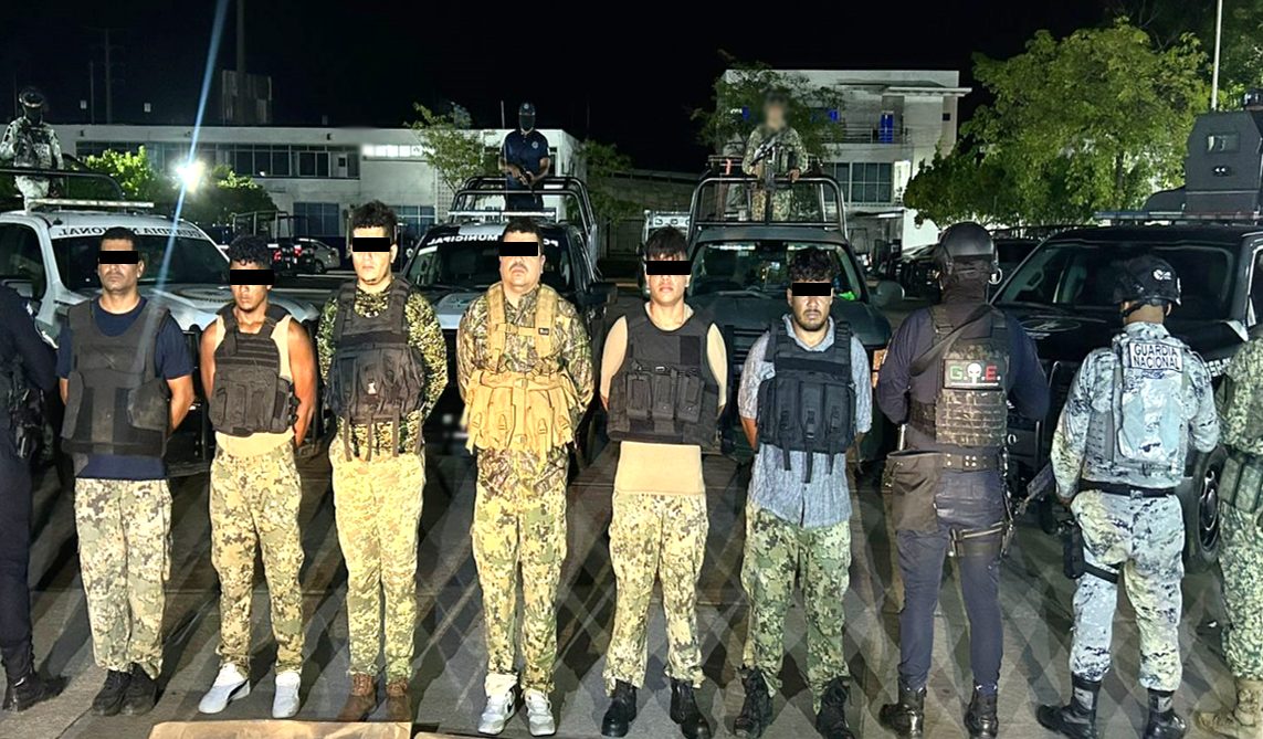 -En Comalcalco, elementos de la GN, Ejército Mexicano, FGR, SSPC y Fiscalía Estatal detuvieron a seis personas, aseguraron cinco armas largas, siete cargadores, 55 cartuchos, seis chalecos tácticos, diversas dosis de drogas y un vehículo.