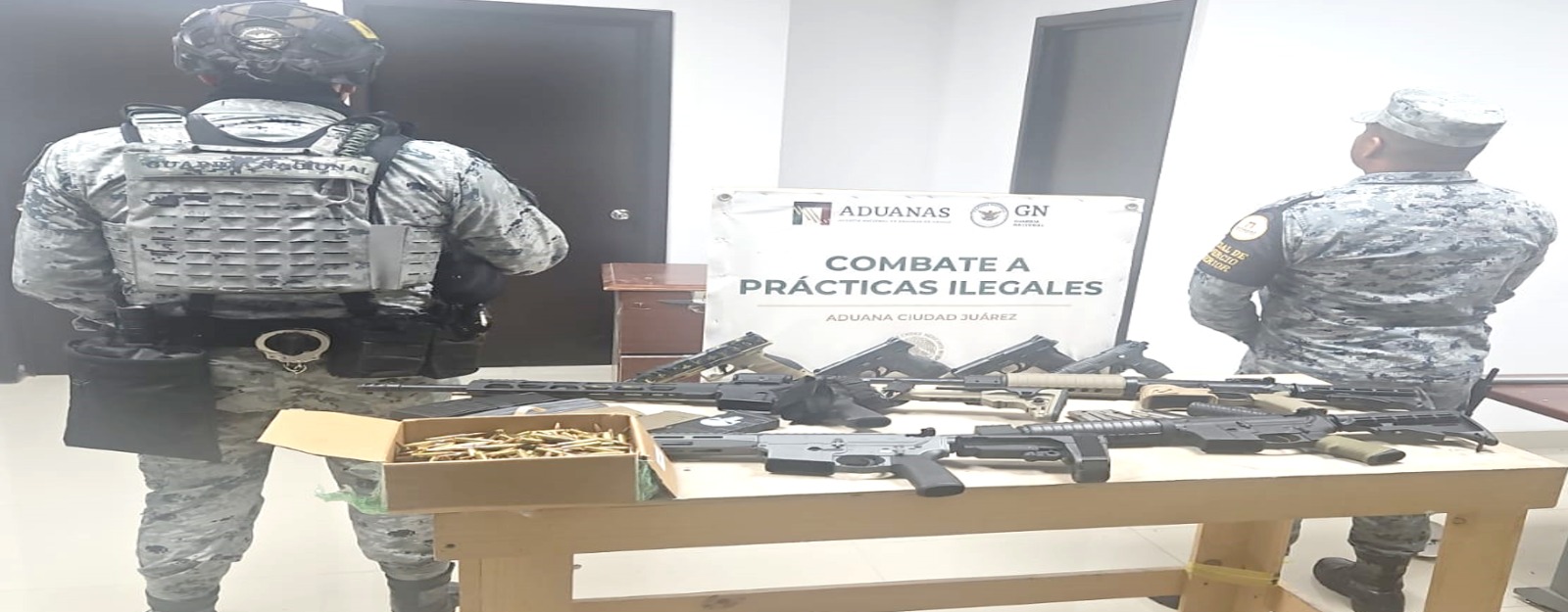 -En Cd. Juárez, elementos de Aduanas, al realizar una inspección en el Puente Internacional Libre-Córdova, detuvieron a una persona de nacionalidad estadounidense, le aseguraron cuatro armas largas, cuatro armas cortas, 11 cargadores, 404 cartuchos, un silenciador y un vehículo.