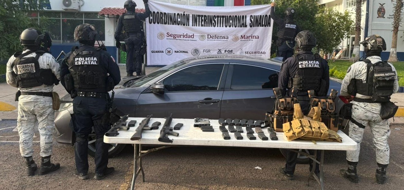 -En Culiacán, en el fraccionamiento Urbivilla del Roble, elementos de GN, Ejército Mexicano, SSPC y Policía Estatal aseguraron tres armas largas, dos armas cortas, 20 cargadores, 579 cartuchos, tres chalecos tácticos, seis placas balísticas y un vehículo.