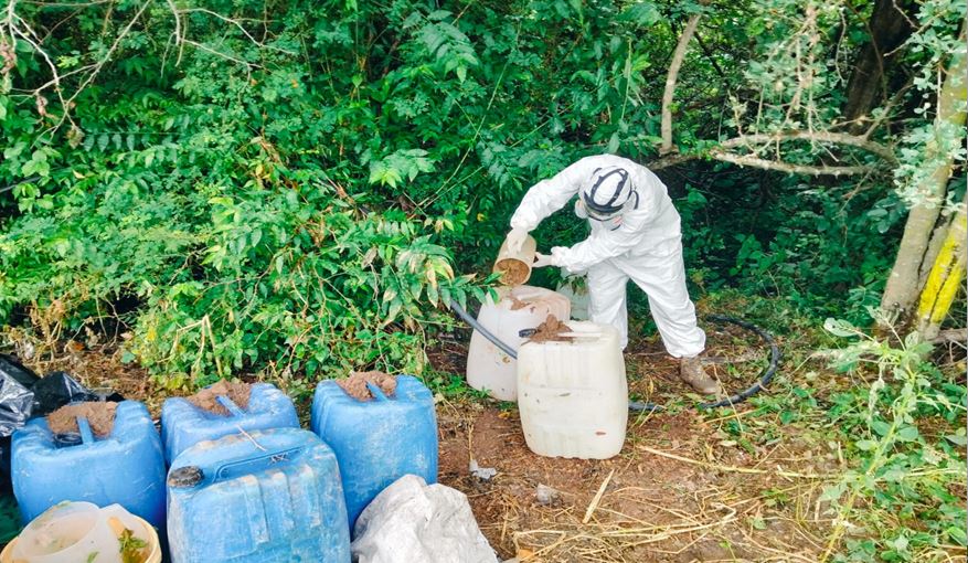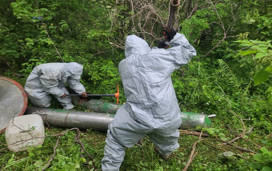 -En Culiacán y Cosalá, Sinaloa, en los poblados de San Antonio, La Tasajera, Santa Anita y Palo Dulce, elementos del Ejército Mexicano localizaron e inhabilitaron cinco áreas de concentración de material diverso para la elaboración de metanfetamina, aseguraron 1,425 litros de sustancias químicas, dos condensadores y tres quemadores.