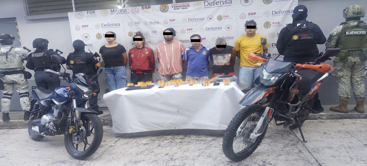 -En Xalapa, elementos de GN, Ejército Mexicano, Fiscalía y Policía Estatal catearon un inmueble, detuvieron a siete personas, aseguraron diversas dosis de drogas, celulares, una laptop y dos motocicletas.