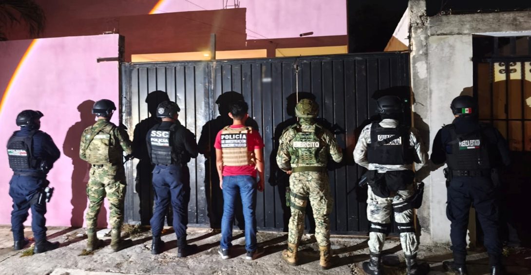 -En Benito Juárez, elementos de GN, Semar, Fiscalía y Policía Estatal catearon un inmueble, detuvieron a dos personas, aseguraron 171 kilos de marihuana, 1.7 kilos de metanfetamina y 96 cartuchos para cigarro electrónico.