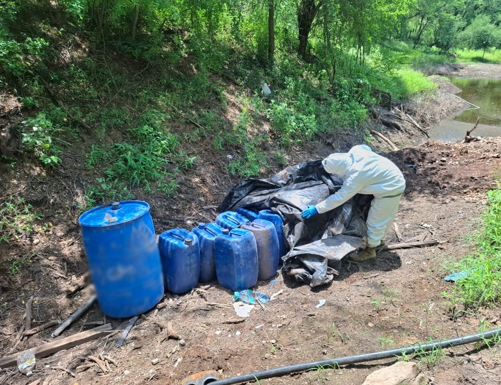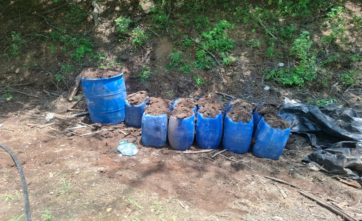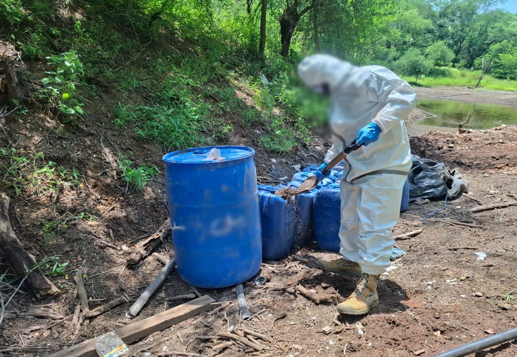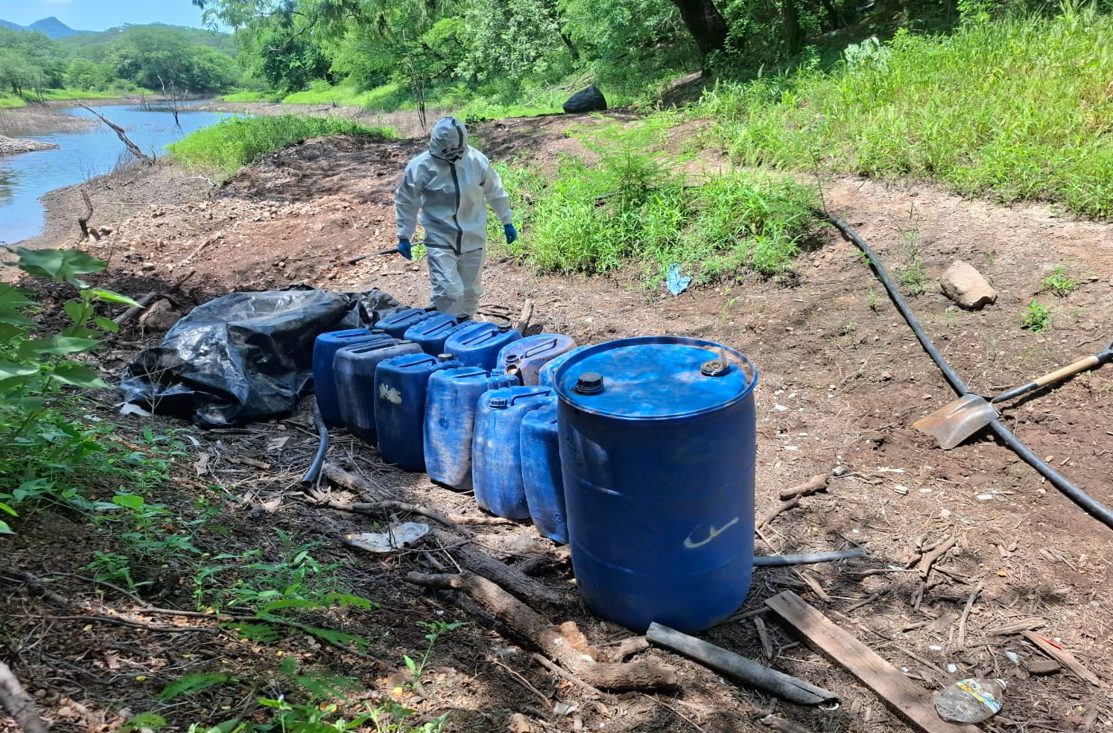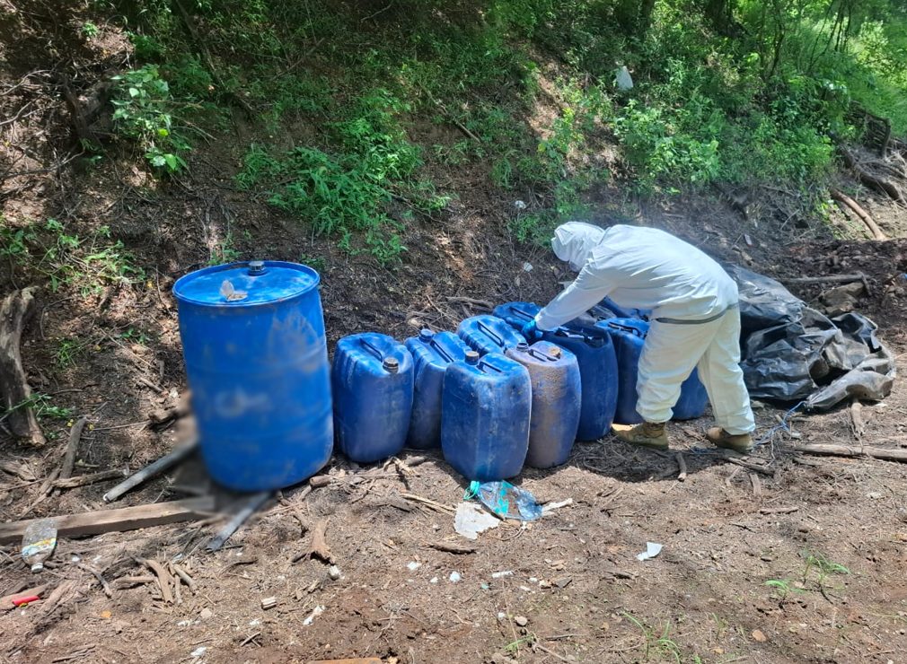 También en la localidad Vinoramas, elementos del Ejército Mexicano localizaron un área de concentración de material diverso donde aseguraron 750 litros de sustancias químicas.