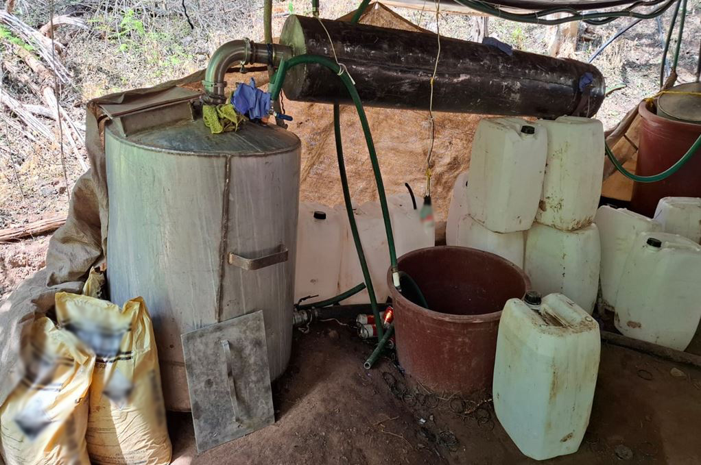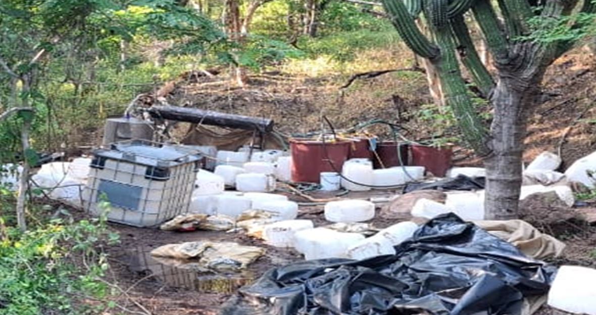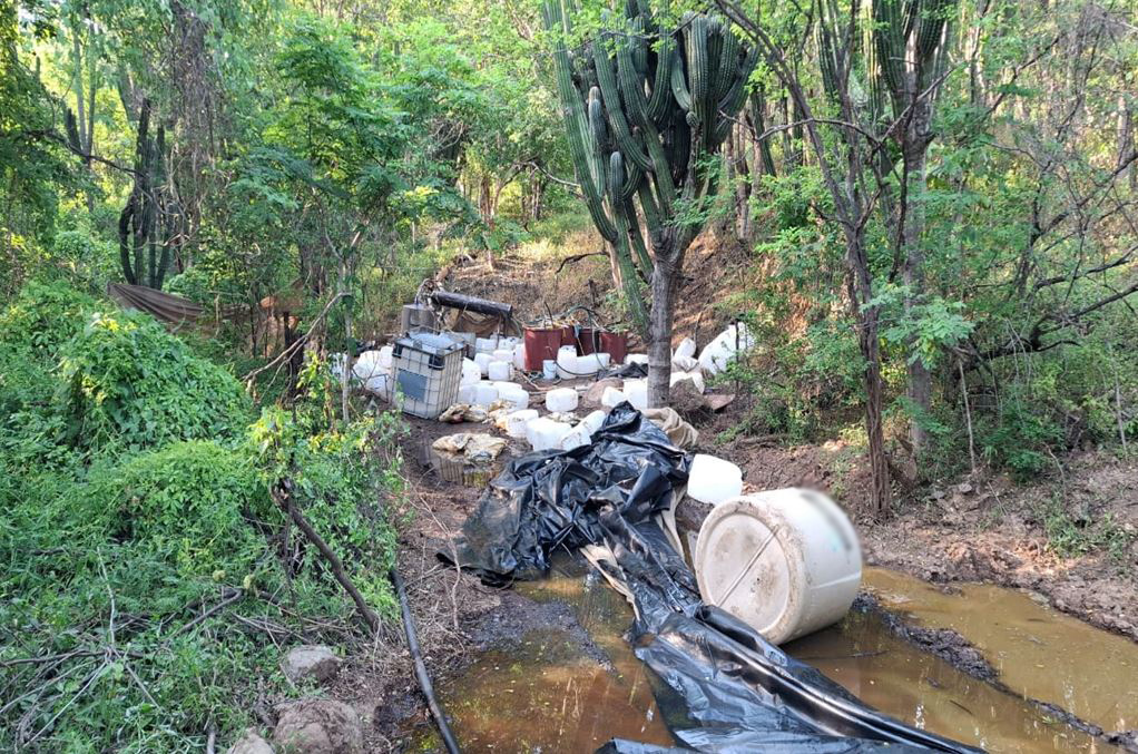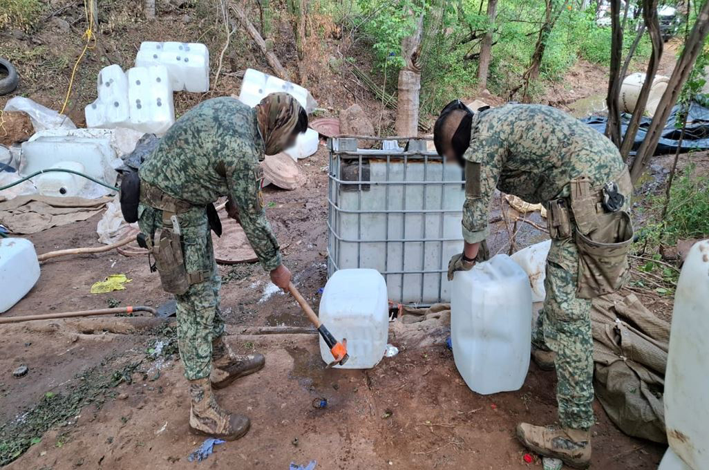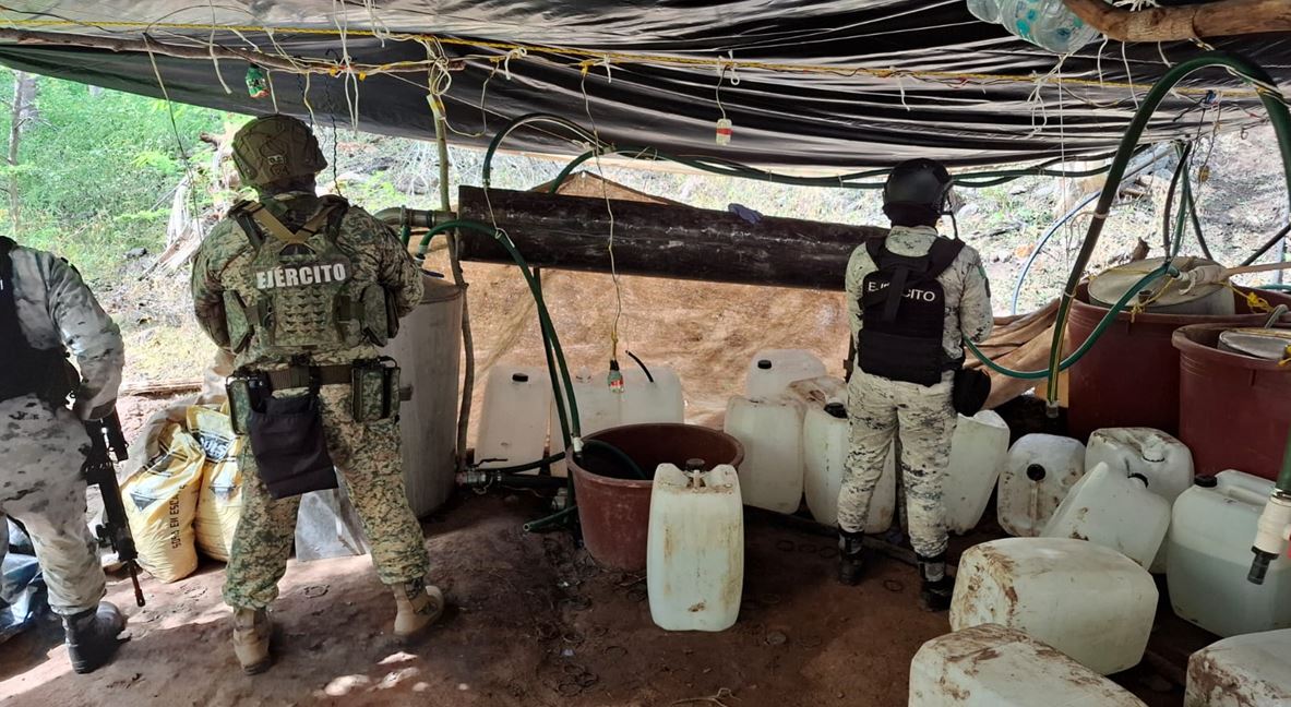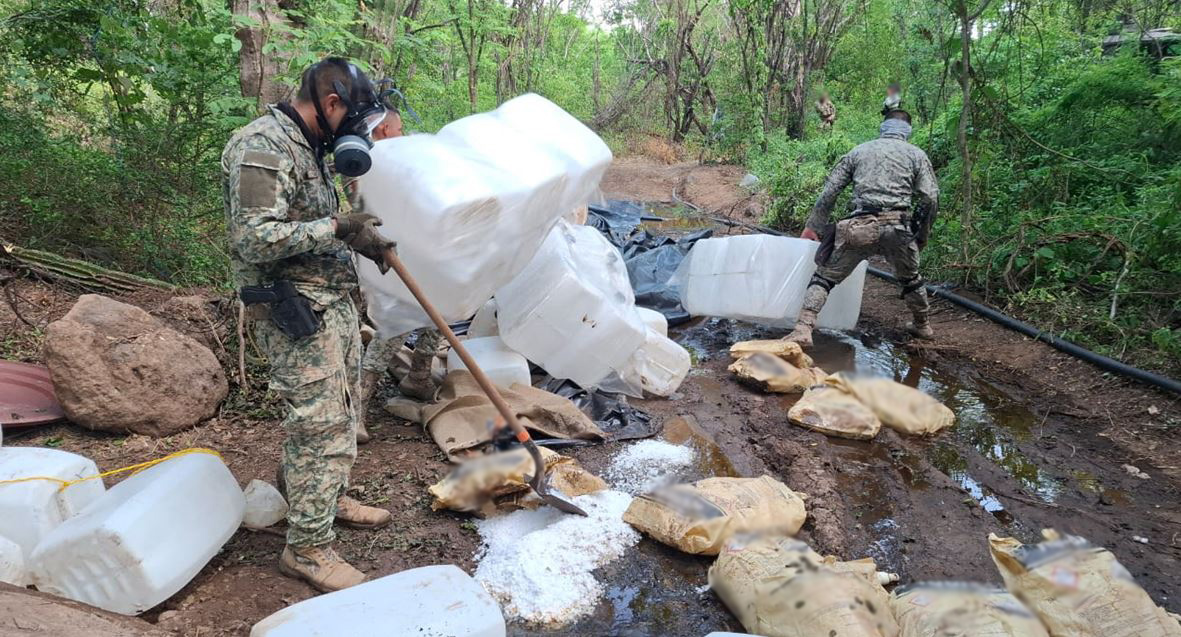 En Culiacán, Sinaloa, en la localidad Vinoramas, elementos del Ejército Mexicano localizaron un laboratorio clandestino para la elaboración de drogas sintéticas, aseguraron un reactor de síntesis orgánica, 500 litros de alcohol etílico, 300 litros de acetona y 250 kilos de sosa cáustica.