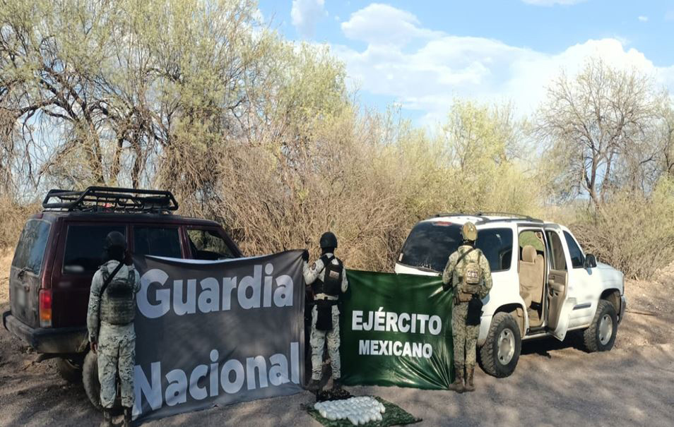 -En Atil, elementos de GN y Ejército Mexicano localizaron dos vehículos con reporte de robo y aseguraron 15.7 kilos de metanfetamina.