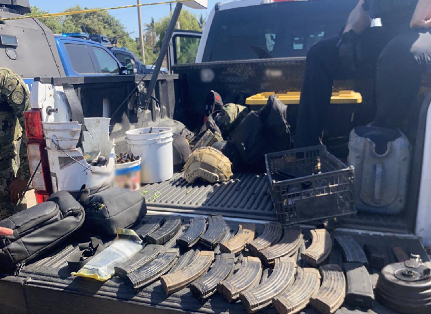 -En Culiacán, en el poblado El Salado, elementos del Ejército Mexicano, GN, Semar, Secretaría de Seguridad y Protección Ciudadana (SSPC), FGR, Fiscalía y Policía Estatal aseguraron cinco armas largas, 227 cartuchos, cargadores, equipo táctico y dos vehículos con reporte de robo.