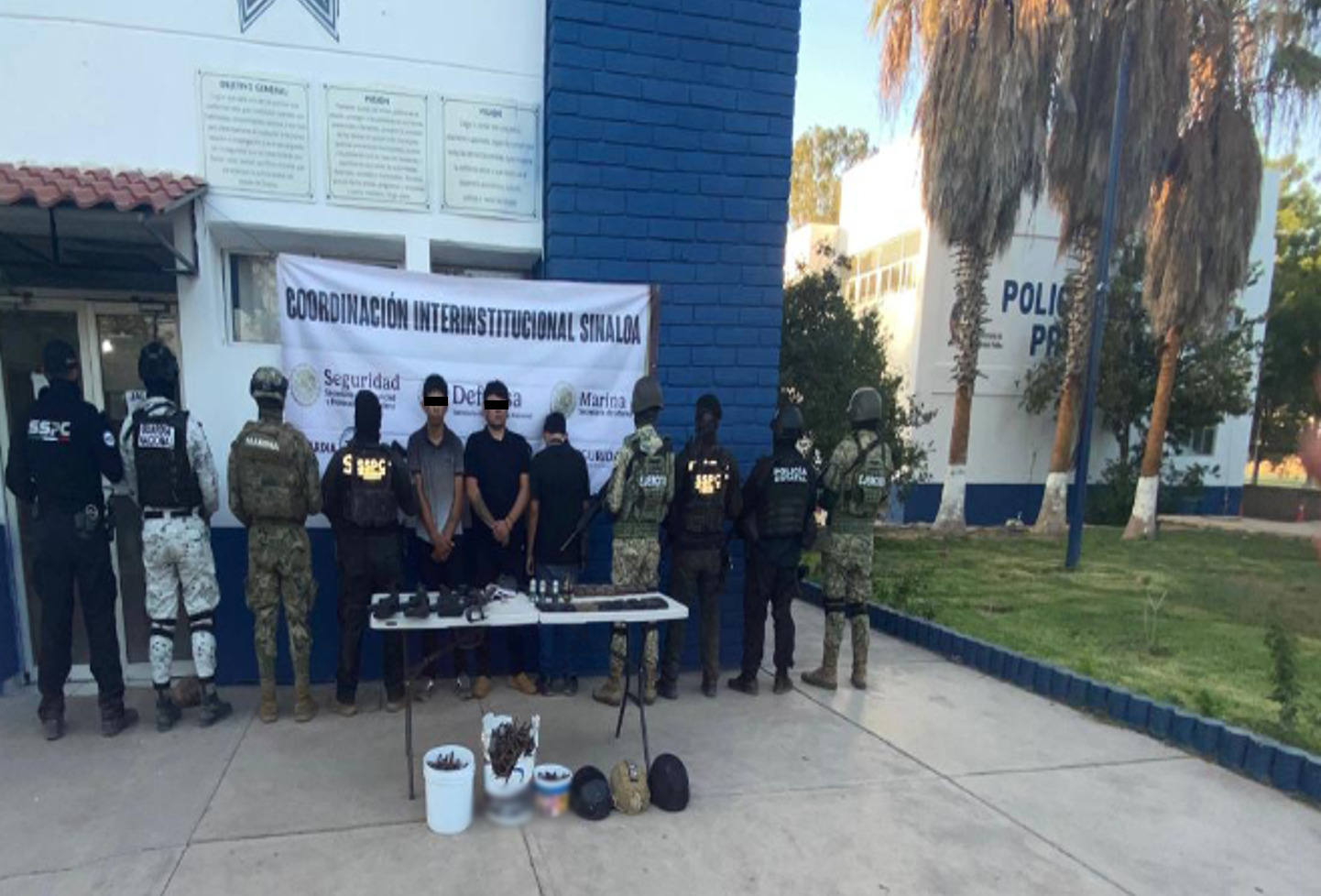 -En Navolato, en el poblado Las Aguamitas, elementos de GN, Ejército Mexicano, Semar, SSPC y Policía Estatal detuvieron a tres personas a las cuales les aseguraron cuatro armas largas, un arma corta, 24 cargadores, 200 cartuchos, cuatro granadas, tres cascos tácticos, ponchallantas, una motocicleta y 10 vehículos.