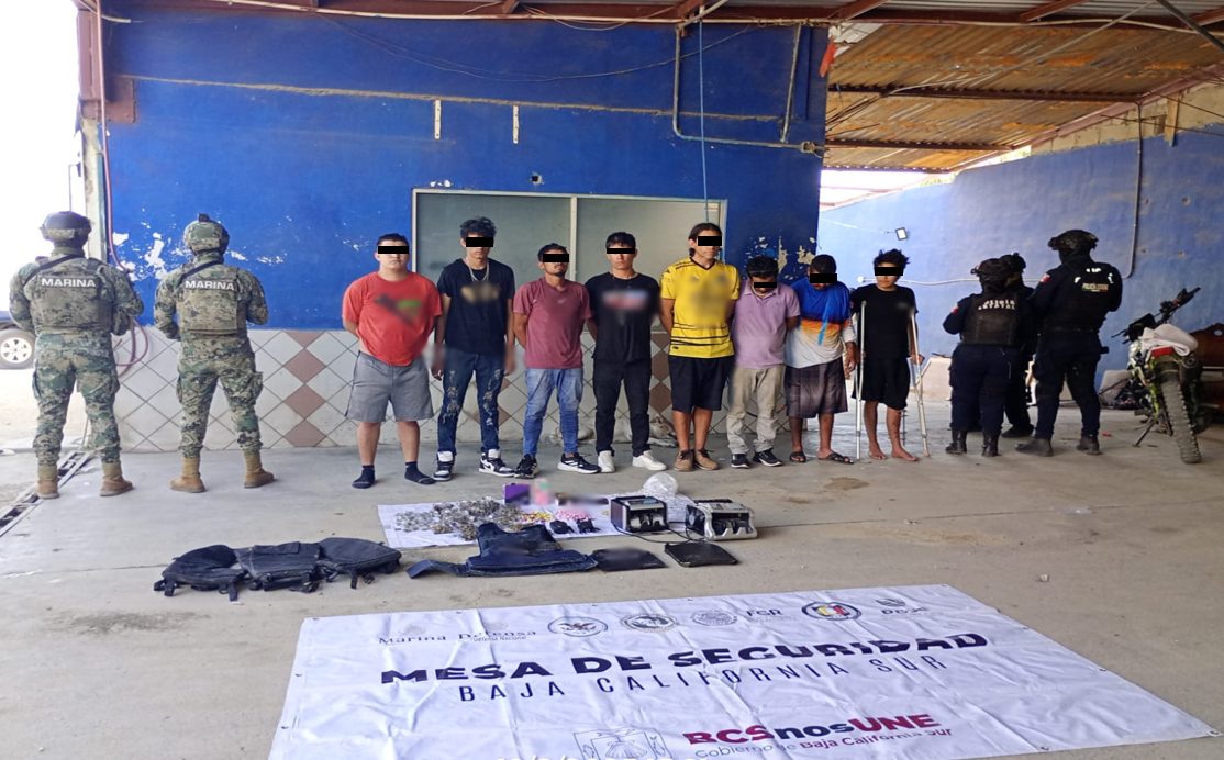 En Baja California Sur, en la colonia Cangrejos, elementos de Semar y Policía Municipal detuvieron a ocho personas con 95 dosis de cocaína, 33 bolsas de marihuana, 52 dosis de marihuana, 445 dosis de metanfetamina, un arma corta, 30 cartuchos útiles, dos chalecos tácticos, 19 cigarros electrónicos, seis máquinas tragamonedas y dos máquinas contadoras de billetes