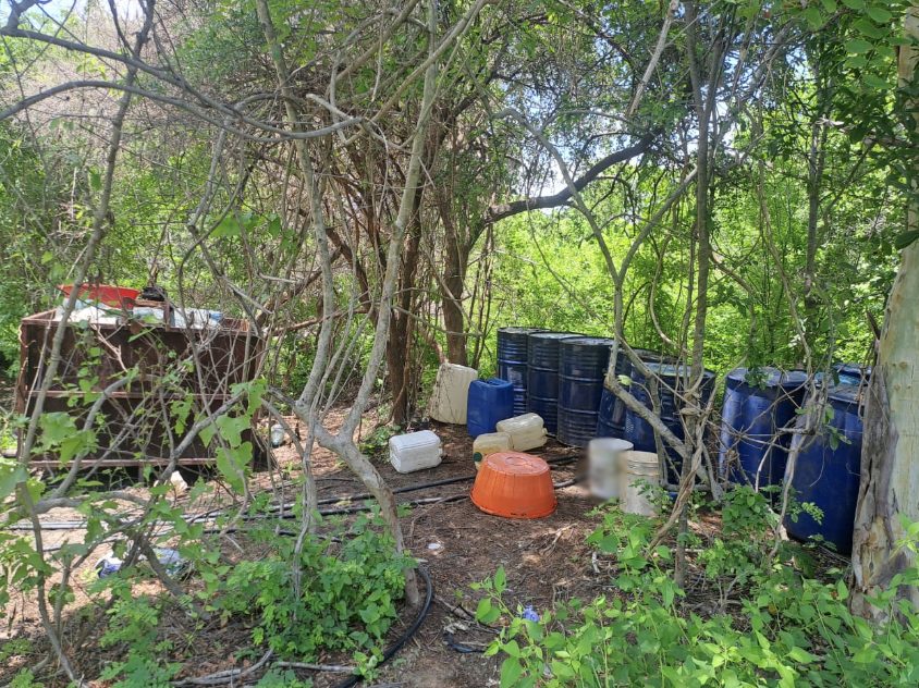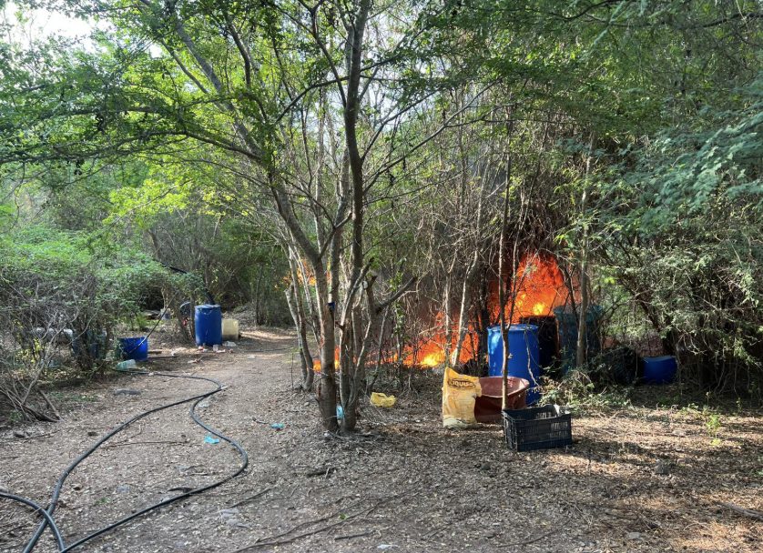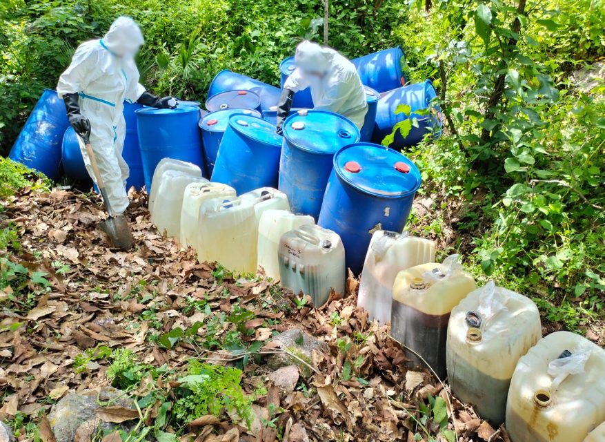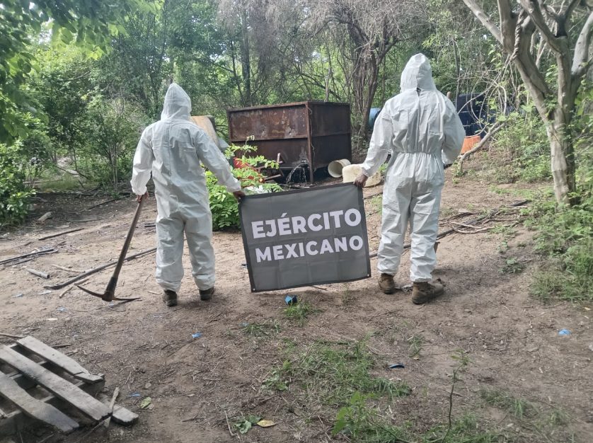 En Culiacán, en los poblados San Cayetano, Los Sabinitos, Rancho Vinoramas, San Miguel de las Mesas, 26 de Enero y Baila, Sinaloa, elementos del Ejército Mexicano inhabilitaron seis áreas de concentración de material diverso para la elaboración de metanfetamina, aseguraron 6,500 litros, 175 kilos de sustancias químicas, dos reactores de síntesis orgánica, cuatro condensadores y una mezcladora.