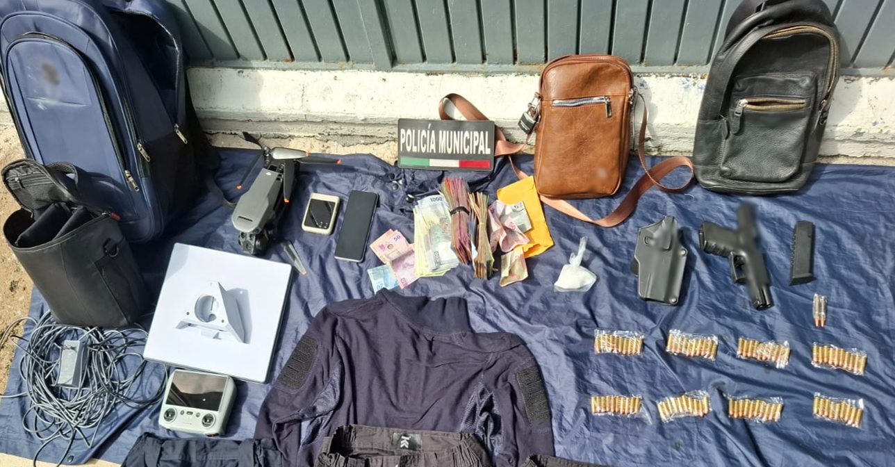 -En Uruapan, elementos de GN, Ejército Mexicano y Policía Municipal detuvieron a dos hombres, les aseguraron un arma corta, cargadores, 82 cartuchos, metanfetamina, una antena satelital, un dron y un vehículo.