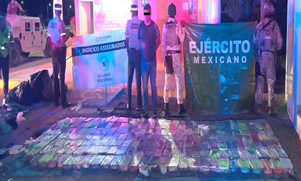 -En Benjamín Hill, elementos de GN y Ejército Mexicano detuvieron a un hombre a bordo de un vehículo, le aseguraron un arma corta, 51 cartuchos y aproximadamente 200 kilos de metanfetamina.
