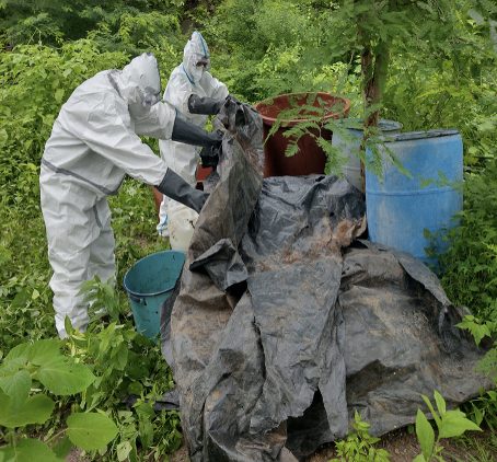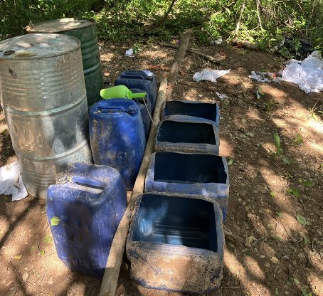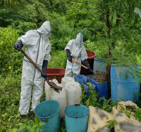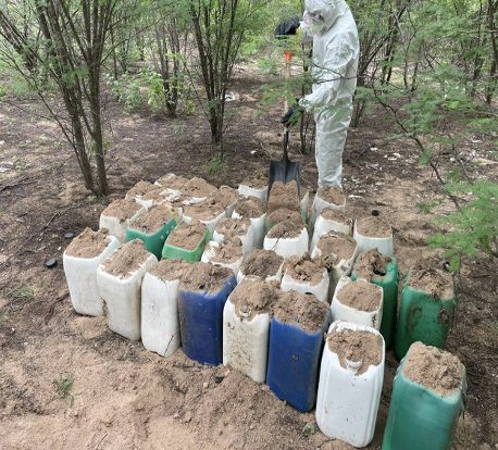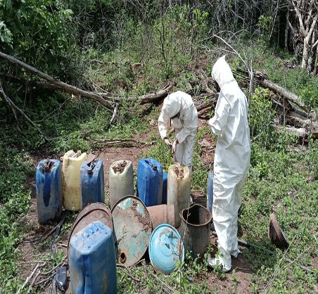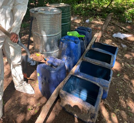 En Culiacán, Sinaloa, en los poblados de El Mirador Sabinito, San Rafael, Nuevo Mundo y El Vizcaíno, elementos del Ejército Mexicano localizaron cuatro áreas de concentración de material diverso para la elaboración de metanfetamina, aseguraron 1,510 litros y 175 kilos de sustancias químicas.