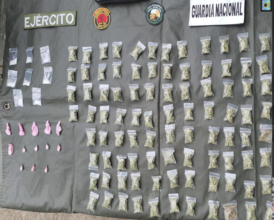 Se detuvo a dos personas, se aseguraron tres armas largas, 20 cargadores, 430 cartuchos, 221 dosis de metanfetamina, 62 dosis de marihuana y un vehículo.