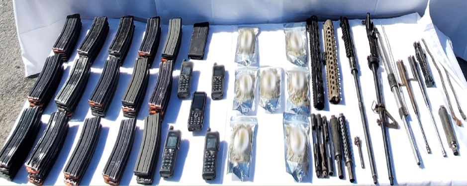 En Camargo, se aseguraron 12 armas largas, 44 cargadores, un fusil, 544 cartuchos, 155 dosis de marihuana, equipo táctico y dos vehículos.