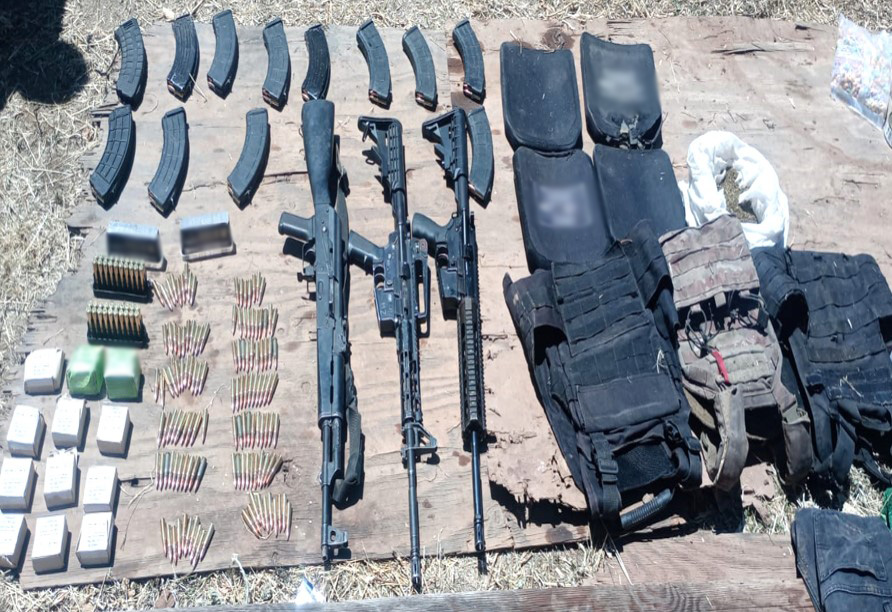 En Camargo, se aseguraron 12 armas largas, 44 cargadores, un fusil, 544 cartuchos, 155 dosis de marihuana, equipo táctico y dos vehículos.