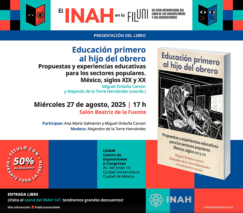 El 27 de agosto, a las 17:00 horas, el INAH presentará el libro Educación primero al hijo obrero. Propuestas y experiencias educativas para los sectores populares. México, siglos XIX y XX (2024), en el Salón Beatriz de la Fuente.