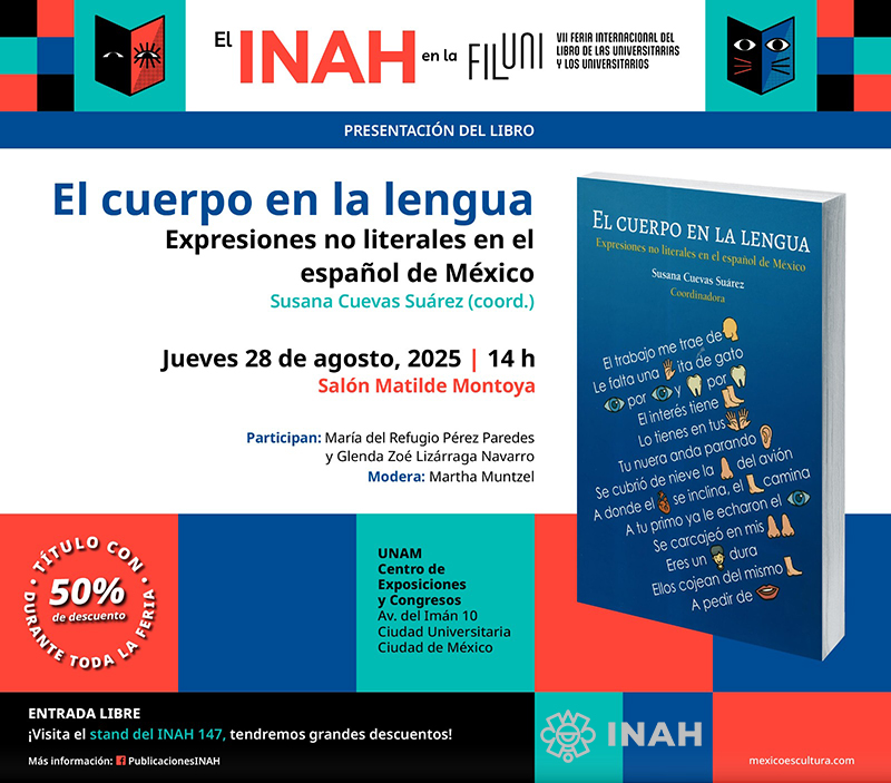 El 28 de agosto, a las 14:00 horas, tocará el turno a El cuerpo en la lengua. Expresiones no literales en el español de México (2024), obra coral coordinada por Susana Cuevas Suárez, cuyo contenido se centra en el análisis lingüístico del uso de palabras vinculadas con la corporalidad en metáforas, metonimias y proverbios populares.