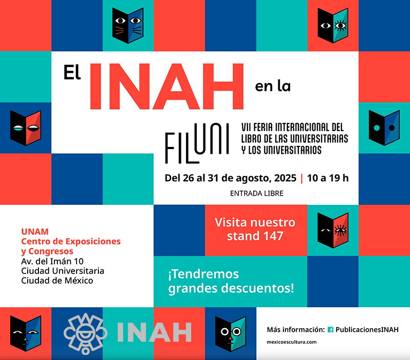 Con una oferta de más de 300 títulos y dos presentaciones editoriales, el Instituto Nacional de Antropología e Historia (INAH) se une a la VII Feria Internacional del Libro de las Universitarias y los Universitarios (Filuni), organizada por la Universidad Nacional Autónoma de México (UNAM), que tendrá lugar del 26 al 31 de agosto de 2025.
