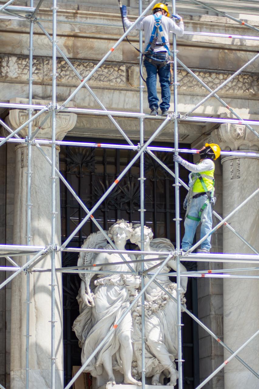 Se realizará igualmente la limpieza de las esculturas ubicadas en los balcones: La Fuerza, La Paz y La Elocuencia, realizadas por el escultor francés Laurent Honoré Marqueste, así como de las obras El Trabajo y La Verdad, elaboradas por el escultor francés Paul Gasq.
