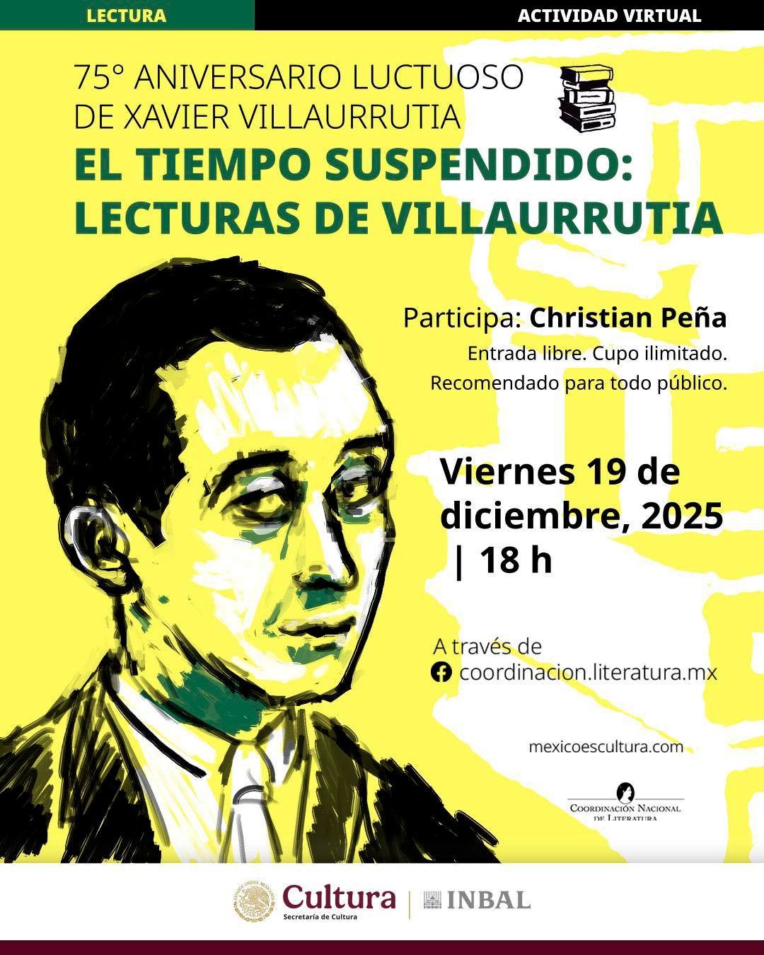 La Secretaría de Cultura del Gobierno de México y el Instituto Nacional de Bellas Artes y Literatura (INBAL), a través de la Coordinación Nacional de Literatura (CNL), recuerdan el 75 aniversario luctuoso de Xavier Villaurrutia, poeta, dramaturgo, ensayista y crítico mexicano, figura clave del grupo literario de los Contemporáneos que revolucionó la cultura mexicana del siglo XX. La conmemoración se llevará a cabo a través de dos charlas virtuales en las que se abordará la vigencia y trascendencia de su obra.