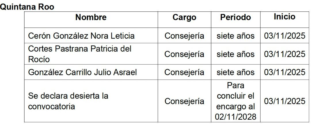 Designó a Patricia del Rocío Cortés Pastrana, funcionaria del Ieqroo, a Nora Leticia Cerón González, funcionaria de la Secretaría de Gobierno, y a Julio Asrael González Carrillo, asesor del Oficial Mayor del Gobierno de Quintana Roo, para ocupar tres vacantes en el Consejo General del Ieqroo a partir del lunes 3 de noviembre.