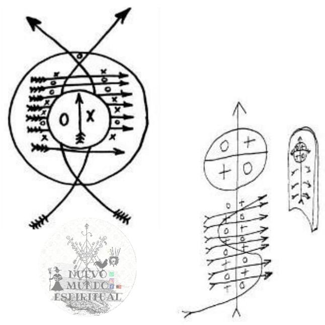 Existen firmas de saludo, de llamada, de cierre, de protección, de ataque, etc., cada una con su diseño revelado por la tradición, al encender el círculo de pólvora (fula) sobre la firma, se considera que esa llave gráfica abre la puerta y el mensaje llega a los espíritus. Los entendidos dicen que las firmas actúan como “mapas o instrucciones” para el muerto: indican qué trabajo se va a realizar y a quién va dirigido.