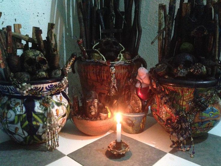 Por ejemplo, en la rama Mayombe es típico tener un caldero grande consagrado a Nsasi Siete Rayos (deidad del rayo) y al muerto principal, y junto a él un Lucero que “vigila la puerta” de la casa o del munanso (templo).