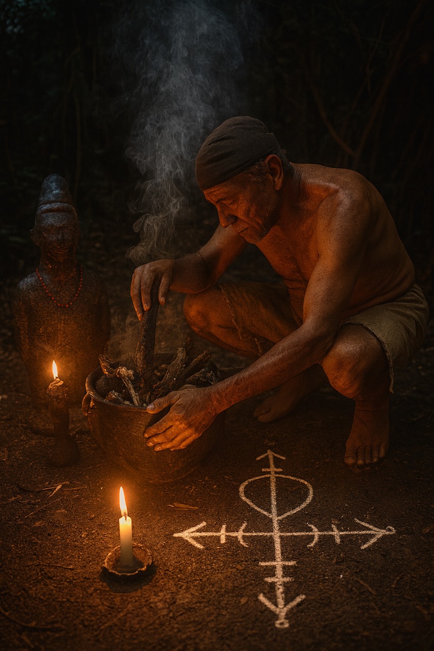 Mientras los tambores imaginarios resonaban en los cánticos y la atmósfera se cargaba de energía, el padrino tomó un puñal y degolló al gallo de un tajo firme, con la sangre del animal roció las raíces de la ceiba devolviendo la ofrenda a la tierra y al espíritu del árbol, y luego enterró el cuerpo del gallo en el hueco cavado, sin cesar los rezos y maldiciones. Antes de cubrir la fosa, introdujo en el agujero un papel con el nombre de la mujer enemiga, sellando simbólicamente su destino.