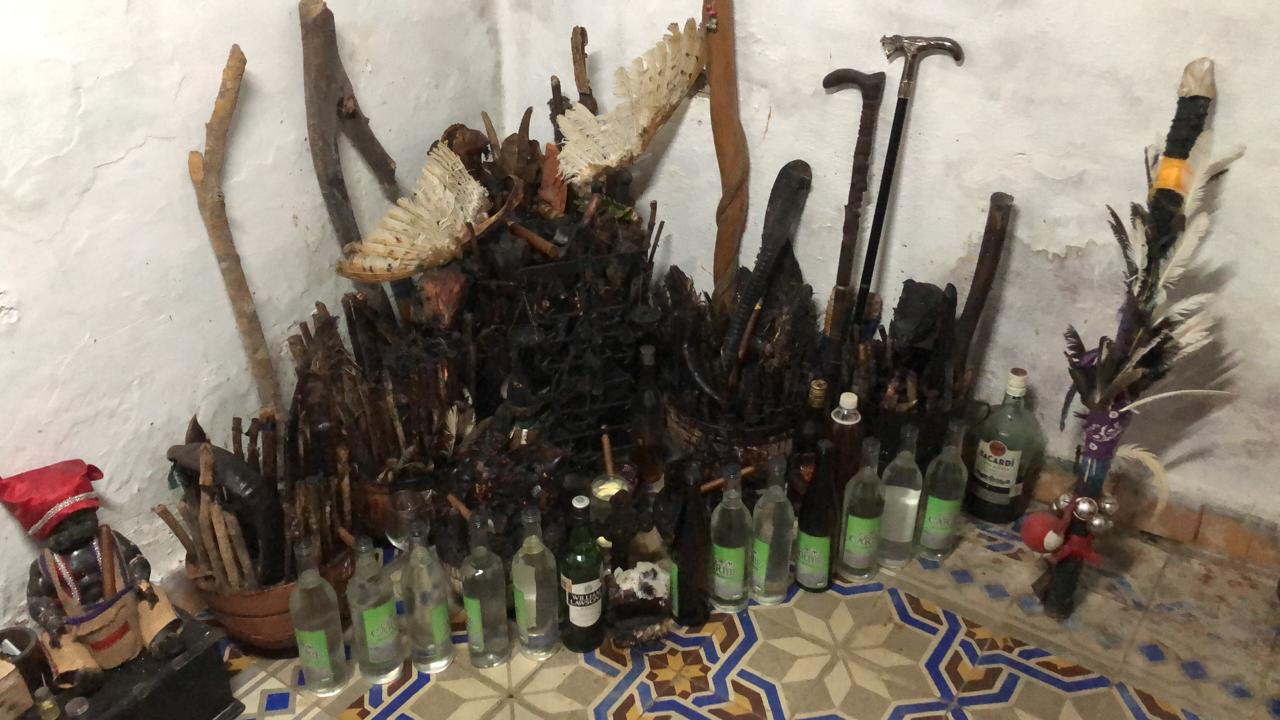 En el altar de un palero pueden verse varios tipos de ngangas o “fundamentos”, repletas de palos de monte, hierros, restos animales preservados y figuras que representan a deidades como Siete Rayos, el señor del trueno.