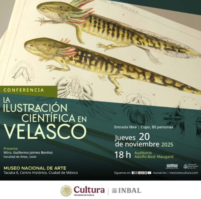 La ilustración científica en Velasco es el título de la conferencia que impartirá el investigador y académico Guillermo Jaimes el 20 de noviembre, a las 17 horas, en el Auditorio Adolfo Best Maugard del Museo Nacional de Arte (MUNAL), recinto del Instituto Nacional de Bellas Artes y Literatura (INBAL). La actividad forma parte del programa académico que acompaña la exposición José María Velasco. Los apuntes del pintor.
