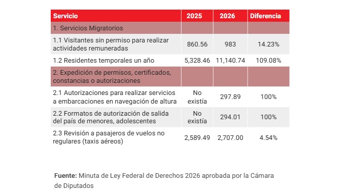 Y una de las tarifas actualizadas para 2026 será el pago de derechos para visitantes extranjeros sin permiso para trabajar, que aumentará de 860 pesos a 983 pesos por persona. Este se otorga a personas que viajan por turismo, negocios o alguna otra actividad no remunerada. “Me parece que es un ajuste para recaudar más por este derecho”, explica Iván Benumea, coordinador del programa de Justicia Fiscal de Fundar.