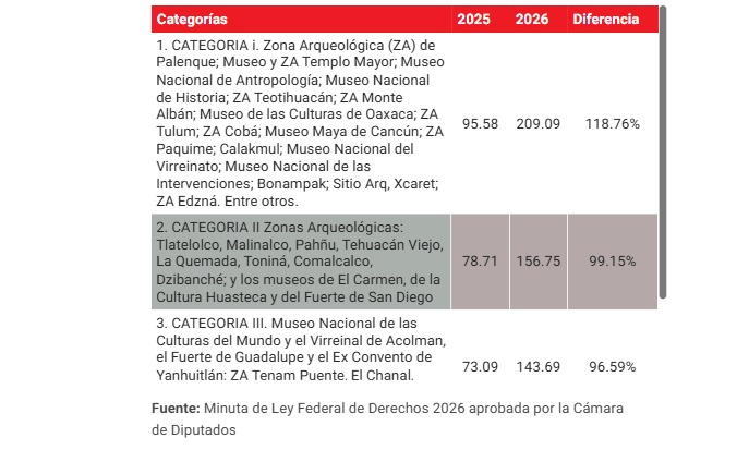 Y las visitas a Museos también sufrirán un alza en el pago de derechos 2026.