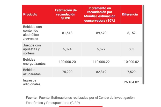 También con cifras bajas, en un escenario en que el Mundial no detonara más que 10 % de aumento en el consumo de todo tipo de bebidas: refrescos, bebidas energetizantes y alcohol, aún así habría una recaudación de 26,000 millones de pesos extra a lo previsto en el PEF 2026.