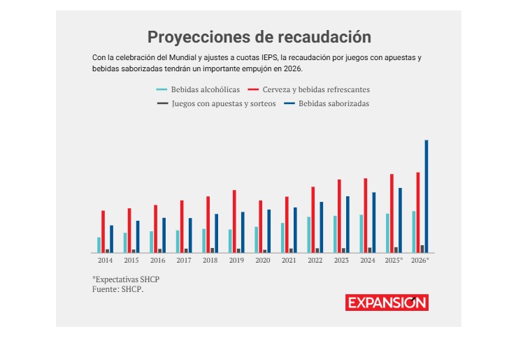 Las cuotas de IEPS en servicios prestados a través de dispositivos digitales, páginas de internet e interfaces, no se había modificado desde 2010 y en 2026 tendrá una actualización de 30% a 50%, por lo que se espera más recaudación por el boom de apuestas relacionadas con el futbol.