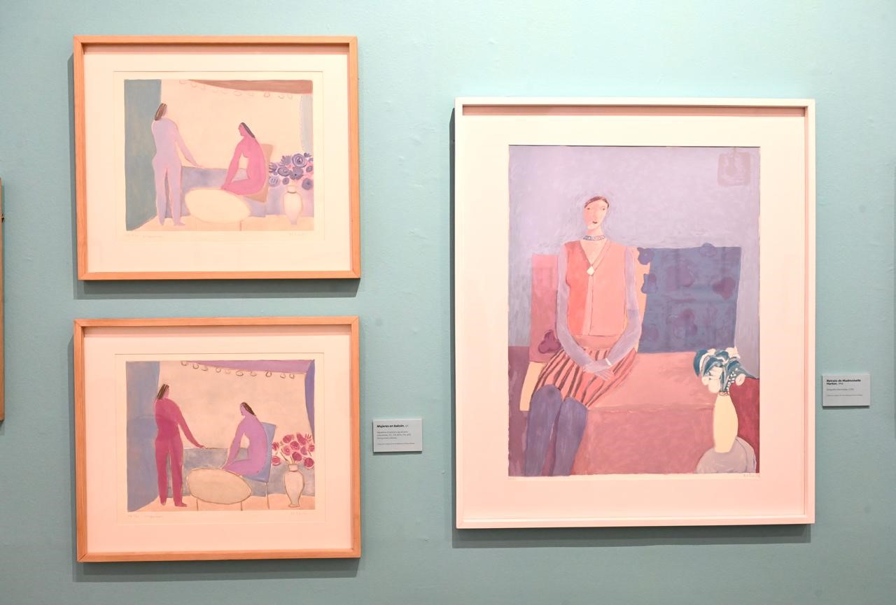 Las obras expuestas abarcan seis décadas de producción gráfica, entre litografía, serigrafía, aguatinta al azúcar, aguafuerte y a la poupée, además de óleos, acrílicos, escultura y cerámica. Proceden del acervo del Munae, de la colección de Trevor Rowe, hijo de la artista, y de diversas colecciones particulares.