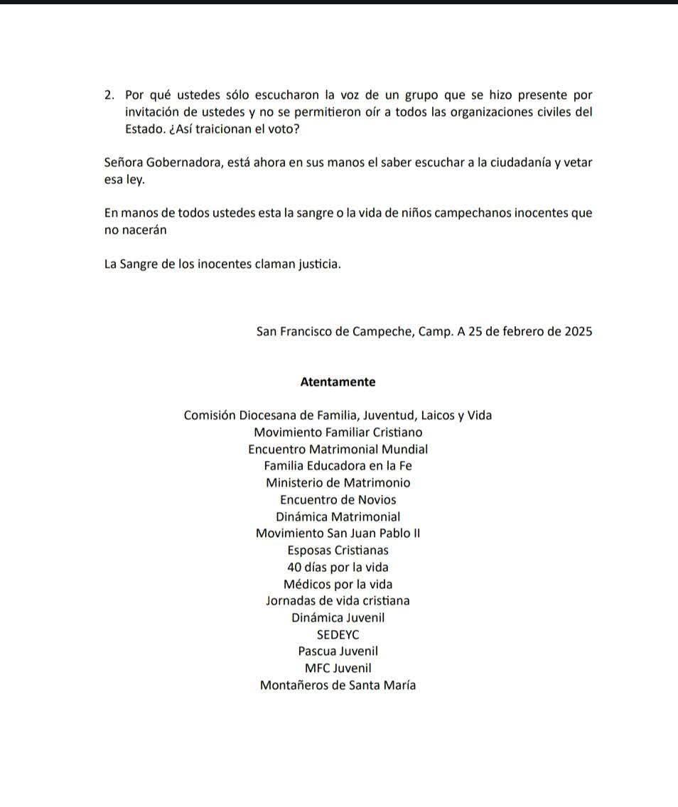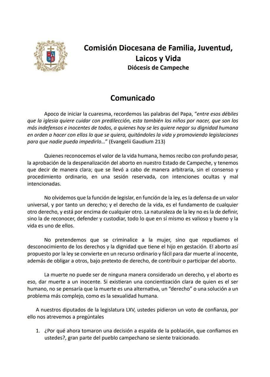 Al respecto es necesario mencoonar que, apenas el 25 de febrero, la Comisión Diocesana de Familia, Juventud, Laicos y Vida Diócesis de Campeche, publicó un comunicado en el que afirmó: