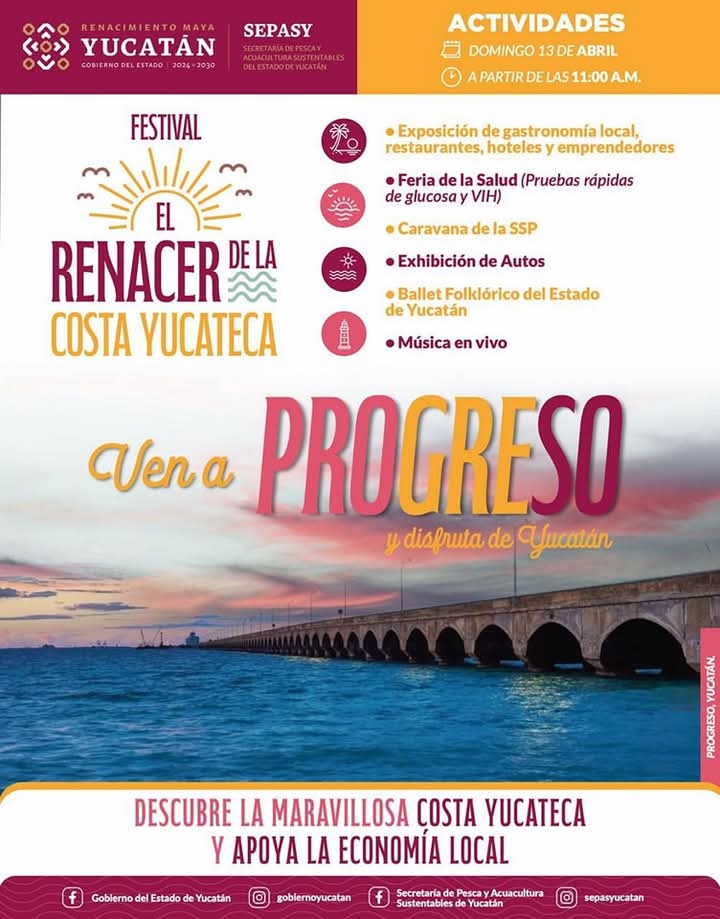 Progreso, Yuc. a 09 de abril de 2025. Este 13 de abril desde las 11 am en el Malecón Tradicional del Puerto de Progreso se llevará a cabo el Festival “El Renacer de la Costa Yucateca 2025”.