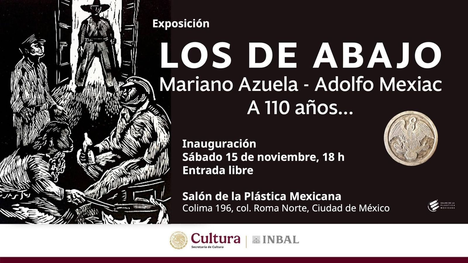 La Secretaría de Cultura del Gobierno de México y el Instituto Nacional de Bellas Artes y Literatura (INBAL), a través del Salón de la Plástica Mexicana (SPM), presentan la exposición Los de abajo. Mariano Azuela – Adolfo Mexiac. A 110 años…, un proyecto conmemorativo por los 110 años de la publicación de la novela Los de abajo, de Mariano Azuela, considerada obra fundacional de la literatura de la Revolución Mexicana.