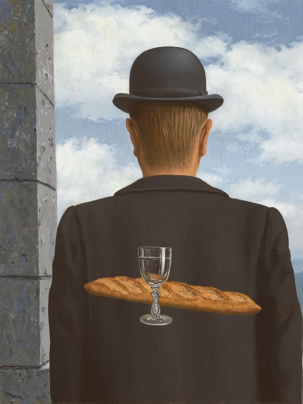 Fechada en 1958, la obra representa al personaje enigmático que ya es parte de la cultura pop, el “hombre común y corriente, pero también misteriosamente anónimo” de Magritte al que se lo ve casi como una silueta, desde atrás. La pieza había estado en la colección privada de la familia de Gilbert Kaplan, empresario, periodista y director de orquesta estadounidense, durante más de 40 años.