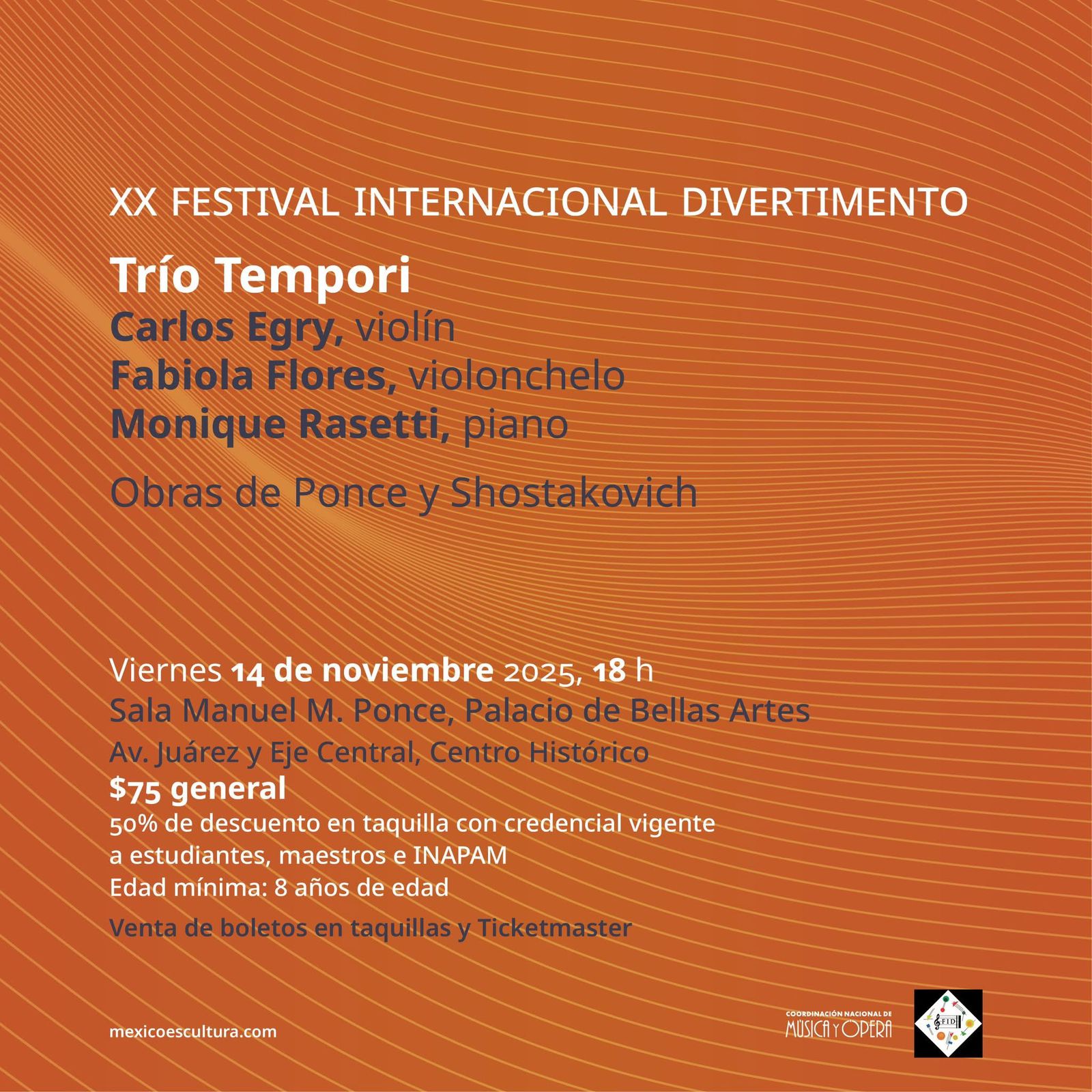 La Secretaría de Cultura del Gobierno de México y el Instituto Nacional de Bellas Artes y Literatura (INBAL), a través de la Coordinación Nacional de Música y Ópera (CNMyO), presentarán al Trío Tempori dentro del XX Festival Internacional Divertimento, en un concierto que se realizará en la Sala Manuel M. Ponce del Palacio de Bellas Artes.