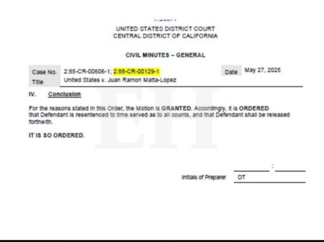 La justicia de Estados Unidos ordenó la liberación inmediata del pionero traficante hondureño Juan Ramón Matta Ballesteros, también identificado como Juan Ramón Matta López, tras otorgarle una reducción compasiva de su pena tras pasar 36 años en prisión.El juez John A. Kronstadt, del Tribunal de Distrito de los Estados Unidos para el Distrito Central de California, dictaminó que el hondureño debía ser resentenciado al tiempo ya cumplido y puesto en libertad sin más demora.“Se concede la moción. Se ordena que el acusado sea resentenciado al tiempo ya cumplido por todos los cargos y puesto en libertad de inmediato”, indica la orden oficial, fechada el 27 de mayo de 2025.