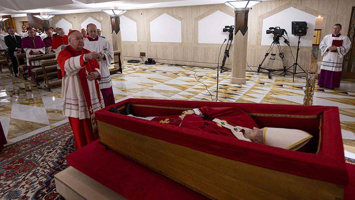 Varios cardenales estuvieron presentes durante la ceremonia privada de despedida donde además de rezar también su cuerpo fue rociado con agua bendita. Su féretro está colocado enfrente de un cristo de madera y una inscripción, en latín, con letras doradas que recorre el techo: ”Veni sancte spiritus reple tuorum corda fidelium”, una oración que al español podría traducirse como: ”Ven Espíritu Santo y llena el corazón de tus fieles”.