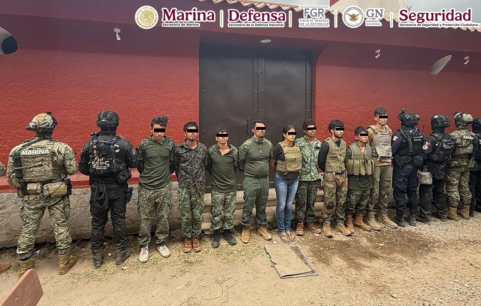 El Gabinete de Seguridad informó que durante la detención de nueve personas fue localizado equipo táctico con la leyenda “Fuerzas Especiales Mencho. Operación Yogurt”