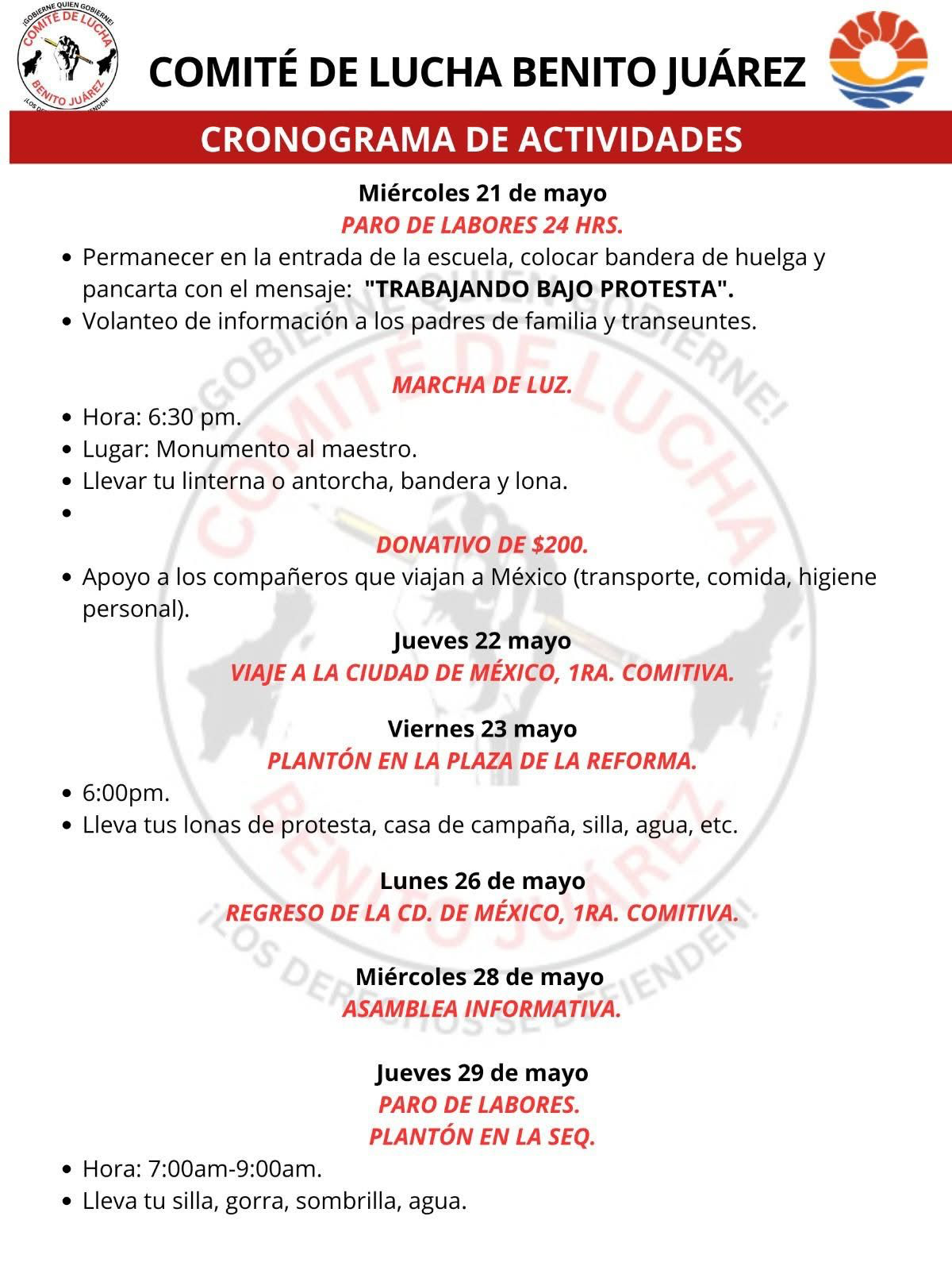 De igual forma, estarán el viernes en el paro convocado en la Ciudad de México y tienen previsto regresar el lunes y el próximo 29 de mayo realizarían un plantón en las instalaciones de la Secretaría de Educación de Quintana Roo del municipio.