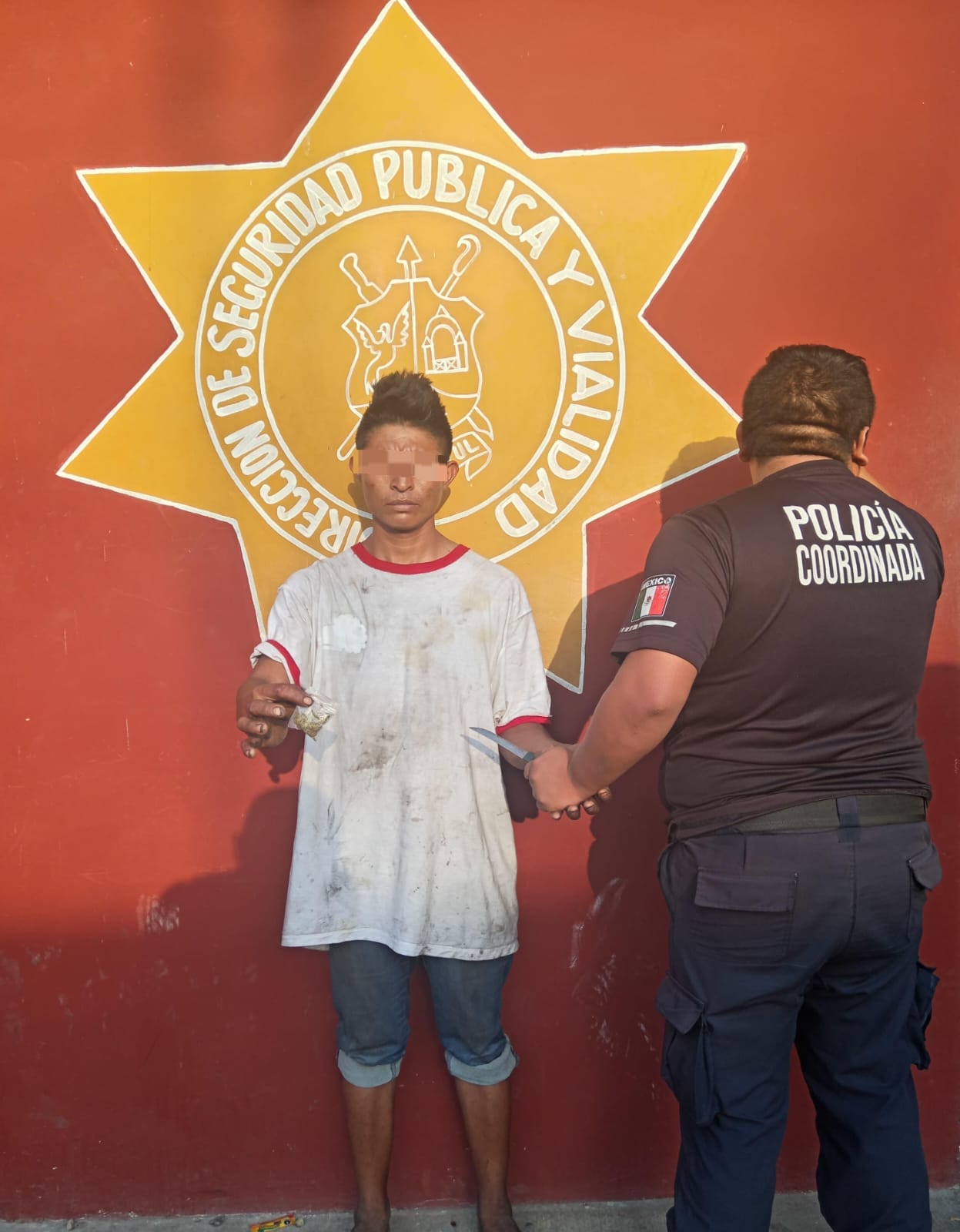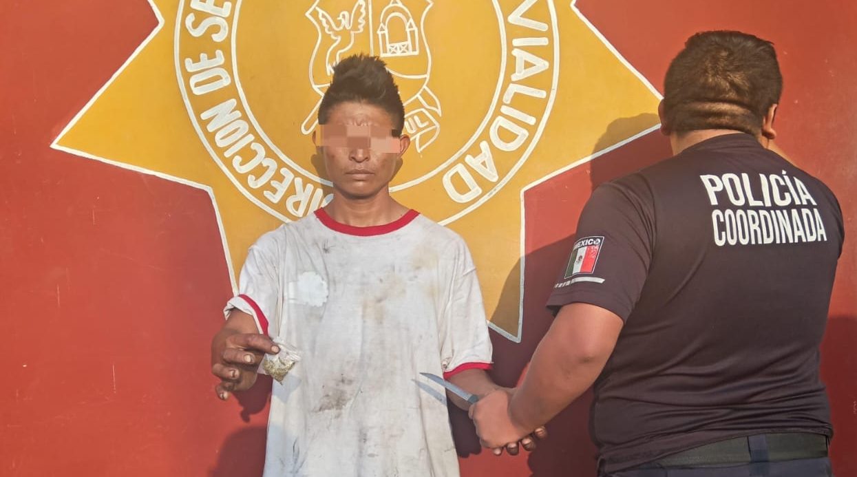 Motul, Yuc. a 25 de marzo.- Elementos de la Policía Municipal de Motul lograron la detención del malandro Gilmer E. T. C., quien fue sorprendido portando un cuchillo de aproximadamente 12 centímetros y con bolsas con marihuana.