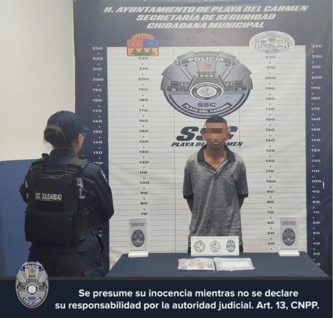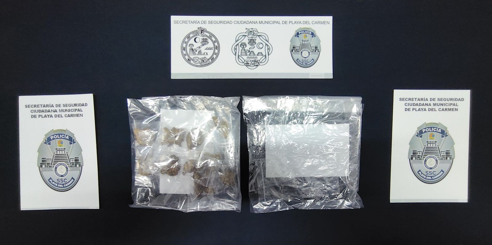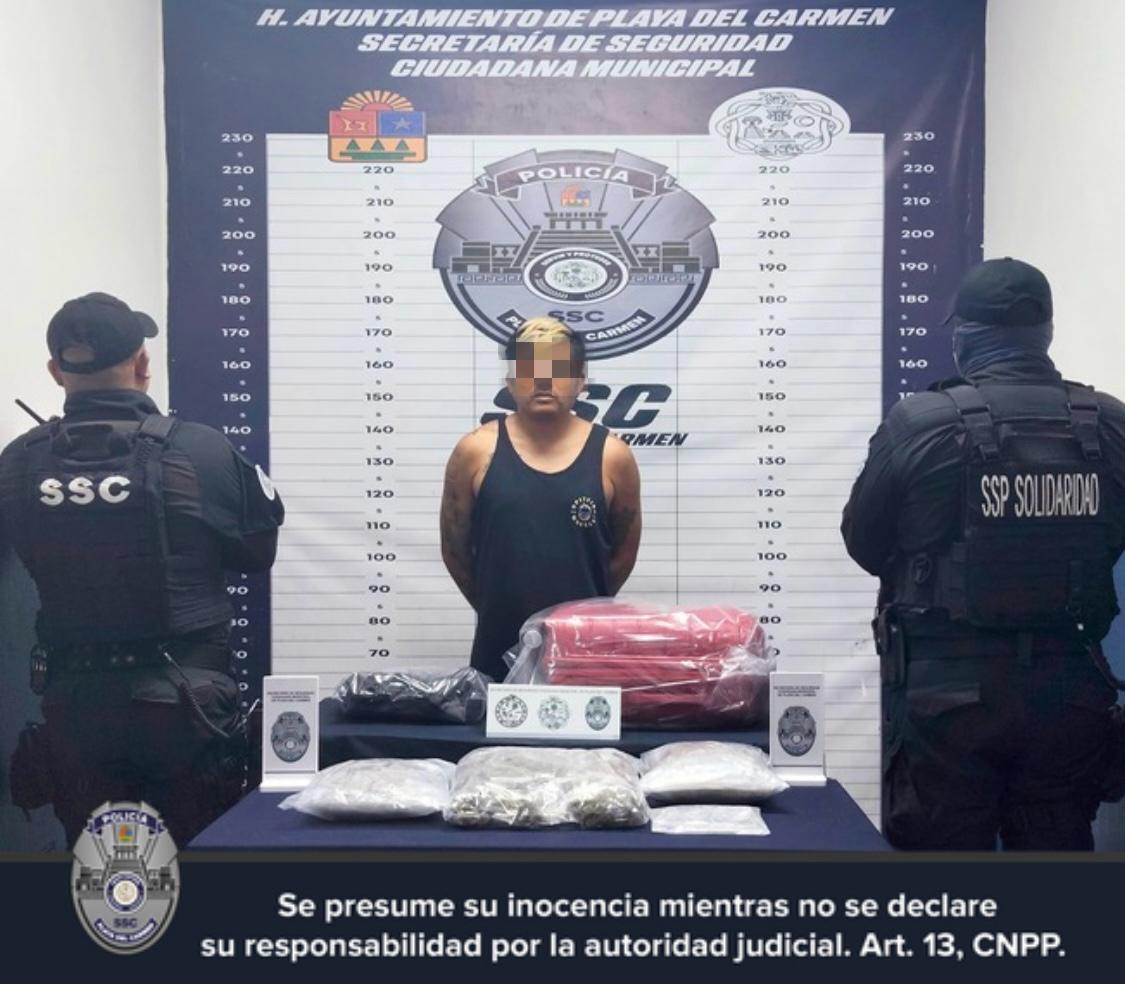 Policías municipales, durante recorrido en calles del fraccionamiento Xcacel, observaron a un individuo al interior de un vehículo manipulando bolsitas con vegetal verde y seco. Tras una inspección, se aseguraron diversos indicios, entre ellos múltiples dosis con las características de la droga conocida como marihuana, dos paquetes adicionales, una maleta, una mochila, un celular y un vehículo. El detenido se identificó como Luis “N”, de 40 años, originario de Veracruz.