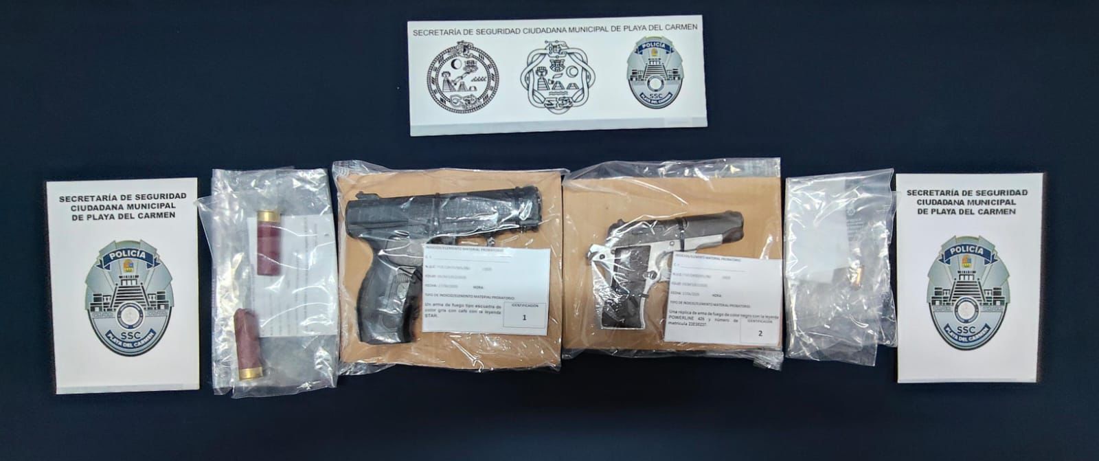 Minutos después, el señalado salió del domicilio y fue reconocido directamente por las víctimas como el agresor, por lo que se procedió a su inspección, encontrándole un arma de fuego tipo escuadra, una réplica, y tres cartuchos útiles.