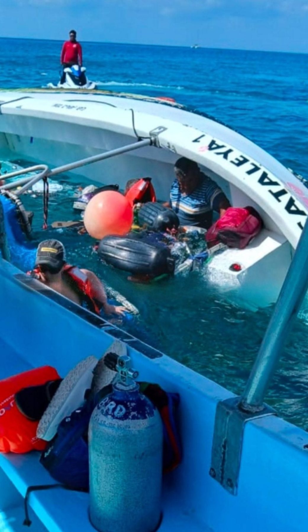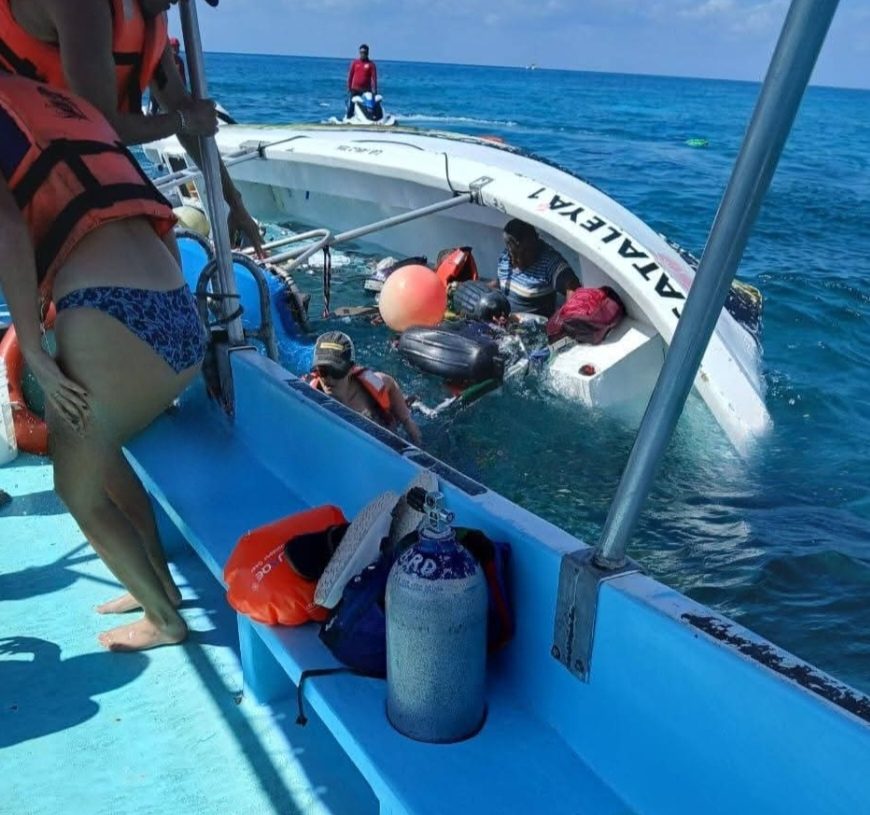 Cozumel, 16 de febrero. – Un nuevo incidente marítimo se registró frente al club de playa Mr. Sanchos, donde la embarcación denominada Cataleya terminó hundida con seis pasajeros a bordo.