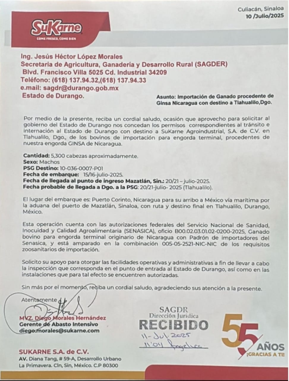 El ganado fue embarcado durante el 15 y 16 de julio en Puerto Corinto, Nicaragua y con fecha probable de llegada al Puerto de Mazatlán, Sinaloa entre el 20 y 21 de julio.