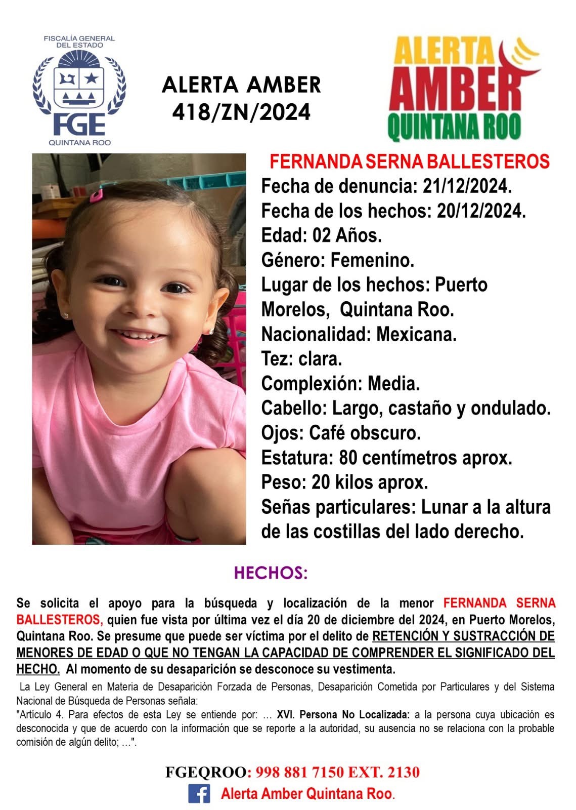 Cancún, Quintana Roo, 22 de diciembre. – La Fiscalía General del Estado (FGE), emitió la Alerta Amber, a fin de buscar y localizar a la menor Fernanda Serna Ballasteros, quien fue vista el 20 de diciembre en el municipio de Puerto Morelos.